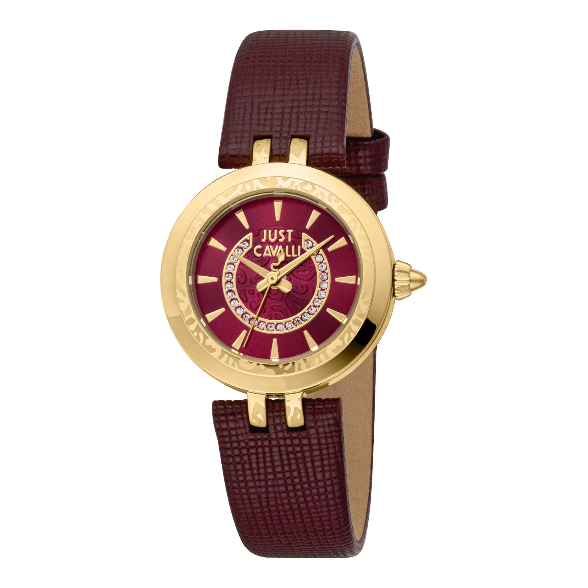 In der lebendigen Welt der Mode, in der Eleganz auf Kühnheit trifft, entsteht eine Uhr, die das Wesen kühner Raffinesse einfängt. Gefertigt im Herzen der Schweizer Uhrmacherkunst, ist diese Just Cavalli Watch aus der illustren Animalier Kollektion ein Zeugnis für das Flair der Marke für das Außergewöhnliche. Ihr rundes Gehäuse, getaucht in einen luxuriösen Gelbgoldton, strahlt einen Sinn für Opulenz aus, der sowohl zeitlos als auch zeitgenössisch ist. Der Durchmesser von 30 mm ist perfekt proportioniert für die moderne Frau, die Subtilität mit einem Hauch von Großartigkeit schätzt. Bis zu 50 Meter wasserdicht, verspricht sie Zuverlässigkeit, ohne auf Stil zu verzichten. Das Mineralglas schützt ein auffälliges rotes Zifferblatt, eine Anspielung auf Pop-Art-Einflüsse, die dieser Uhr eine verspielte und dennoch schicke Persönlichkeit verleihen. Das rote Lederarmband, gesichert mit einer klassischen Dornschließe, ergänzt das Zifferblatt und schafft eine harmonische Verbindung von Farbe und Textur. Im Inneren sorgt das präzise Quarzwerk dafür, dass die Zeit mit makelloser Genauigkeit gehalten wird, während die Drei-Zeiger-Anzeige eine klare und elegante Ablesung bietet. Diese Uhr ist nicht nur ein Accessoire, sondern ein Statement für modebewusstes Denken, entworfen für diejenigen, die es wagen, mit Anmut und Selbstvertrauen aufzufallen.