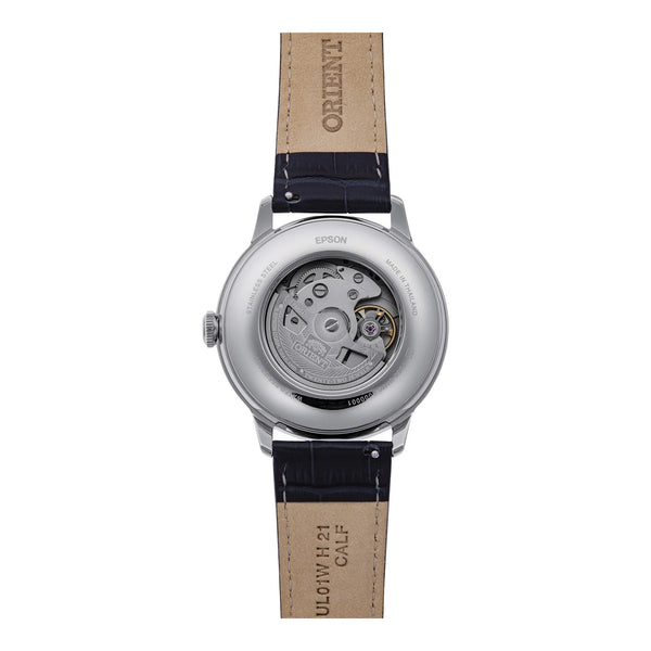 Im Reich zeitloser Eleganz erscheint die ORIENT AK08 Bambino Sun & Moon als ein Leuchtturm klassischer Raffinesse. Gefertigt im Herzen der horologischen Tradition, verkörpert diese Uhr die perfekte Verbindung von Kunstfertigkeit und Präzision. Ihr rundes Gehäuse, getaucht in einen silbergrauen Farbton, strahlt ein raffiniertes Design aus, das das Wesen zurückhaltenden Luxus einfängt. Mit einem Durchmesser von 41 mm sitzt sie anmutig am Handgelenk, ein Zeugnis ihrer tadellosen Handwerkskunst. Das nachtblaues Lederarmband, gesichert mit einer Dornschließe, ergänzt den tiefen, himmlischen Farbton des Zifferblatts und schafft eine harmonische Symphonie aus Farbe und Textur. Unter dem Mineralglas enthüllt das Zifferblatt eine fesselnde Anzeige von Tag und Datum, orchestriert vom mechanischen Werk des Kalibers F6B24. Mit 22 Steinen und einer täglichen Genauigkeit von +25/-15 ist dieses Zeitmessgerät ein Wunderwerk der Technik, das sowohl Handaufzug- als auch Automatikfunktionen bietet. Der transparente Boden lädt dazu ein, den filigranen Tanz seiner inneren Mechanik zu beobachten, ein faszinierendes Schauspiel für das anspruchsvolle Auge. Wasserresistent und für den modernen Gentleman entworfen, ist diese ORIENT Classic Uhr mehr als nur ein Accessoire, sie ist ein Statement für dauerhaften Stil und Raffinesse, ein Begleiter für diejenigen, die die feinen Dinge im Leben schätzen.