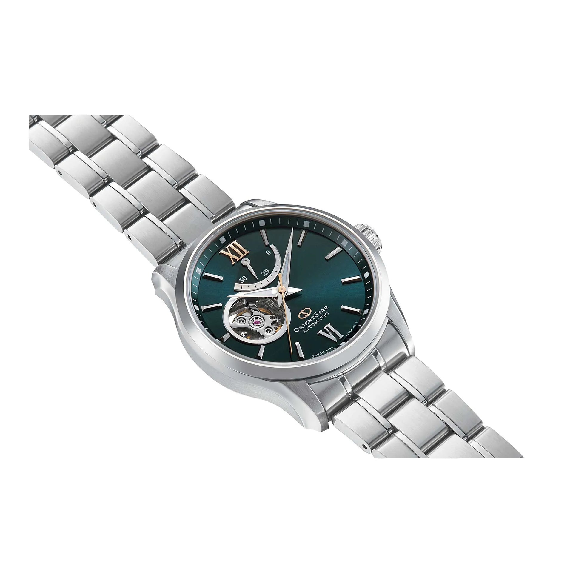 Im Bereich der Zeitmesser, wo Eleganz auf alltägliche Funktionalität trifft, steht diese Uhr als Zeugnis für raffiniertes Design und lässige Raffinesse. Gefertigt aus einer harmonischen Mischung aus silbergrauem Edelstahl, strahlt ihr rundes Gehäuse mit einem ausgewogenen Durchmesser von 39 mm eine zeitlose Anziehungskraft aus. Das grüne Zifferblatt, eine Hommage an die Ruhe der Natur, wird von einem Saphirglas geschützt, das Klarheit und Widerstandsfähigkeit gewährleistet. Mit einer Wasserdichtigkeit von bis zu 100 Metern verspricht sie Zuverlässigkeit sowohl in städtischen als auch in abenteuerlichen Umgebungen. Der transparente Boden bietet einen Einblick in das komplexe Innenleben der Uhr, eine subtile Erinnerung an die Kunstfertigkeit im Inneren. Das Armband, das den silbergrauen Farbton des Gehäuses aufgreift, schmiegt sich bequem um das Handgelenk und wird durch eine Faltschließe mit Druckknopf für Komfort und Sicherheit gesichert. Diese Uhr mit ihrer Pull-&-Push-Krone ist nicht nur ein Accessoire, sondern ein Begleiter für den modernen Mann, der Stil mit Substanz in jedem Ticken verbindet.