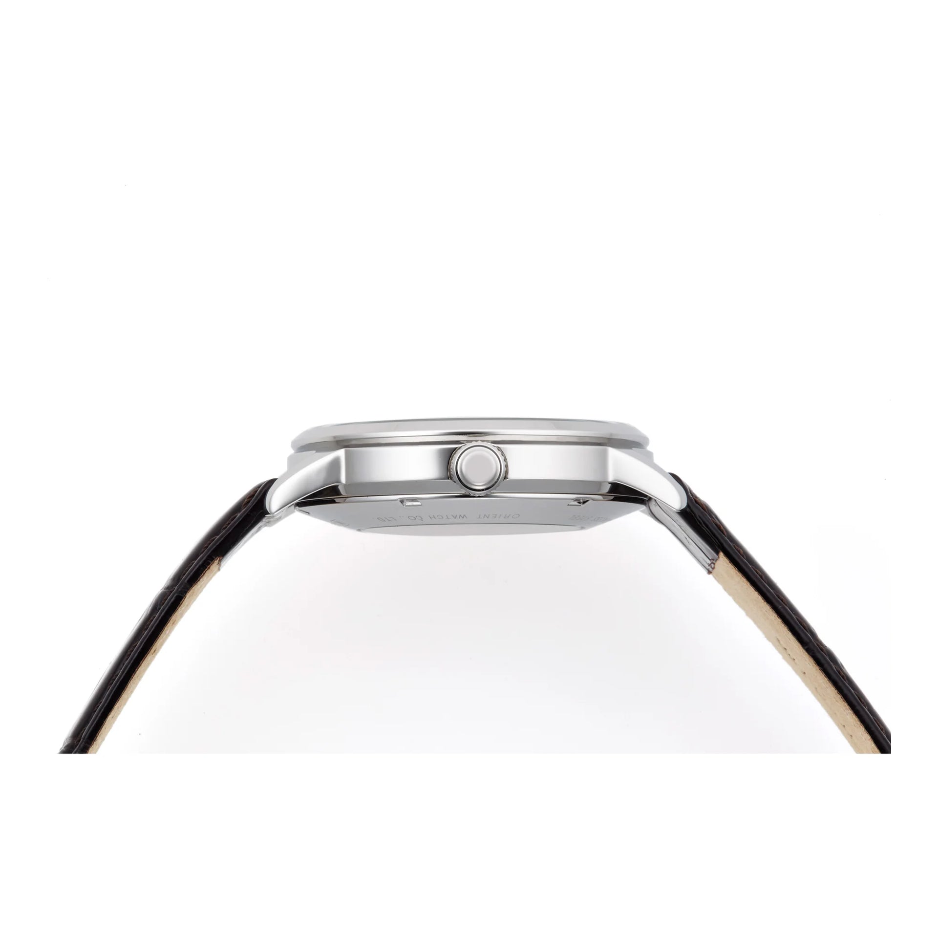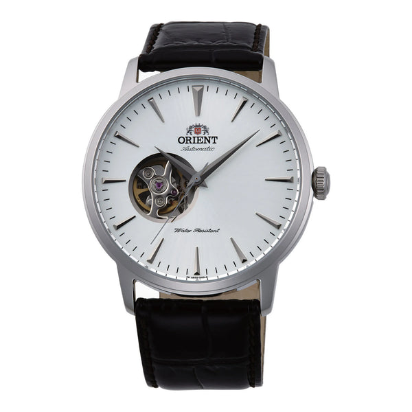 Im Bereich zeitloser Eleganz steht die ORIENT AG02 Open Heart Uhr als ein Zeugnis klassischer Raffinesse. Mit Präzision gefertigt, fängt dieses Meisterwerk aus der ORIENT Classic Familie das Wesen eines verfeinerten Designs ein. Ihr rundes, silbergraues Gehäuse mit einem Durchmesser von 41 mm strahlt eine subtile, aber dennoch eindrucksvolle Präsenz am Handgelenk aus. Das hellgraue Zifferblatt, geschmückt mit einem faszinierenden Open Heart Merkmal, bietet einen Einblick in das komplexe mechanische Uhrwerk, das diese Uhr antreibt. Mit 22 Steinen und einem Kaliber F6T22 verspricht sie Genauigkeit und Zuverlässigkeit und weist eine tägliche Präzision von +25/-15 auf. Der transparente Boden offenbart die Kunstfertigkeit im Inneren, eine wahre Freude für Uhrenliebhaber. Eingefasst in Mineralglas ist die Uhr bis zu 50 Meter wasserdicht und gewährleistet Haltbarkeit, ohne auf Stil zu verzichten. Das schwarze Lederarmband, gesichert mit einer Dornschließe, ergänzt die klassische Ästhetik der Uhr und macht sie zum perfekten Begleiter für den modernen Gentleman. Die Pull & Push Krone fügt einen Hauch von Praktikabilität hinzu, während die automatischen und handaufgezogenen Funktionen Vielseitigkeit für jeden Anlass bieten. Diese ORIENT Uhr ist nicht nur ein Zeitmessgerät, sondern ein Statement von Eleganz und Tradition, ein Stück, das Trends überdauert und die Zeit besteht.