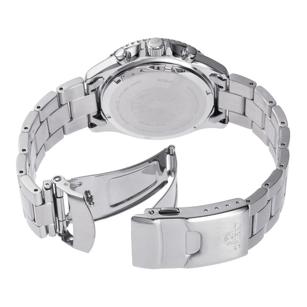 Im Bereich der Zeitmessung, wo Präzision auf Eleganz trifft, erscheint die ORIENT TX02 Mako Solar Chrono, ein Meisterwerk aus der angesehenen ORIENT Sports Kollektion. Für den modernen Abenteurer gefertigt, verkörpert diese Uhr den Geist der Erkundung mit ihrem raffinierten Design und makellosen Funktionalität. Das runde Gehäuse, getaucht in ein elegantes Silbergrau, misst beeindruckende 42 mm im Durchmesser und setzt an jedem Handgelenk ein mutiges Statement. Das nachtblau Zifferblatt, das an den tiefen Ozean bei Dämmerung erinnert, verleiht einen Hauch von Geheimnis und Reiz, während das Saphirglas Klarheit und Haltbarkeit gewährleistet. Für die Tiefen konstruiert, bietet diese Uhr eine Taucher-Wasserbeständigkeit von 200 Metern und ist somit ein idealer Begleiter für aquatische Abenteuer. Das Edelstahlarmband, ebenfalls in Silbergrau, ergänzt das Gehäuse und bietet sowohl Stärke als auch Stil, gesichert mit einer Faltschließe mit Druckknopf und Sicherheitsverschluss für zusätzliche Sicherheit. Angetrieben von der Sonne sorgt das Solaruhrwerk dafür, dass diese Uhr ebenso nachhaltig wie stilvoll ist, wobei das Kaliber VS752 ihren Chronographen und 24-Stunden-Zeitfunktionen antreibt. Die verschraubte Krone und der Datumsanzeiger erhöhen die Praktikabilität und machen sie zu einer vielseitigen Wahl für den anspruchsvollen Gentleman. Die ORIENT TX02 Mako Solar Chrono ist nicht nur eine Uhr, sondern ein Zeugnis für die Verschmelzung von Technologie und zeitlosem Design, perfekt für diejenigen, die sowohl Abenteuer als auch Eleganz in ihrem Alltag suchen.