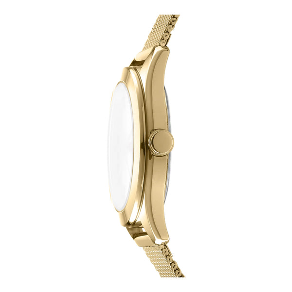 Im Herzen urbaner Eleganz, wo Mode auf Funktion trifft, entsteht eine Uhr, die den Geist moderner Raffinesse verkörpert. Die DKNY DK1L032 Astoria Logo Uhr ist ein Zeugnis der Kunst des verfeinerten Designs, gefertigt, um den dynamischen Lebensstil der zeitgenössischen Frau zu ergänzen. Ihr rundes Gehäuse, getaucht in das warme Leuchten von Gelbgold, fängt die Essenz zeitloser Anziehungskraft ein, während der Durchmesser von 34 mm ein perfektes Gleichgewicht zwischen Zurückhaltung und Statement gewährleistet. Das champagnerfarbene Zifferblatt, das an einen goldenen Sonnenuntergang erinnert, verleiht einen Hauch von Opulenz und lädt die Trägerin ein, sich in Momenten des Luxus zu verlieren. Unter seinem Mineralglas tanzt die Drei-Zeiger-Anzeige anmutig, angetrieben von präzisem Quarzwerk, das sicherstellt, dass jede Sekunde mit Eleganz markiert wird. Das Edelstahlarmband, ebenfalls in Gelbgold, schmiegt sich wie ein zartes Schmuckstück um das Handgelenk und ist mit einer verstellbaren Schiebeschließe für eine persönliche Passform gesichert. Mit einer Wasserdichtigkeit von bis zu 50 Metern ist diese Uhr nicht nur ein Modeaccessoire, sondern ein zuverlässiger Begleiter für die Abenteuer des Lebens. Die Pull & Push-Krone fügt einen Hauch von Praktikabilität hinzu und ermöglicht einfache Anpassungen. Diese DKNY Uhr ist mehr als nur ein Zeitmesser, sie ist ein Stil-Statement, eine Feier der Weiblichkeit und eine Hommage an die lebendige Energie der Stadt, die niemals schläft.