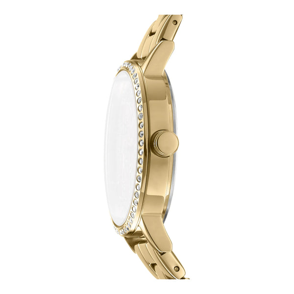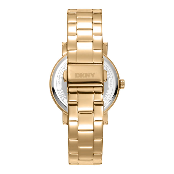Die DKNY Soho Logo in Gelbgold ist ein Symbol zeitloser Luxus. Ihr 36mm rundes Gehäuse und das Edelstahlarmband strahlen Opulenz aus, während das silbergraue Zifferblatt eine zeitgenössische Note hinzufügt. Bis zu 50 Meter wasserdicht, ist diese Uhr für diejenigen konzipiert, die klassische Eleganz mit modernem Flair schätzen, und macht sie zu einem perfekten Accessoire für jede Veranstaltung.