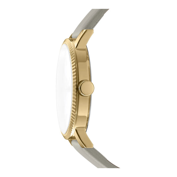 Im pulsierenden Herzen von New York City, wo Mode auf Funktion trifft, entsteht eine Uhr, die den Geist moderner Eleganz verkörpert. Die DKNY DK1L034 Soho Maxi Uhr ist ein Zeugnis der lebendigen Energie der Stadt, die niemals schläft. Mit ihrem runden Gehäuse, das in luxuriösem Gelbgold plattiert ist, fängt diese Uhr das Wesen von Raffinesse und Stil ein. Das 40-mm-Gehäuse ist perfekt proportioniert für die zeitgenössische Frau, die sowohl Form als auch Funktion schätzt. Mit einem raffinierten Design gefertigt, bietet sie eine Wasserdichtigkeit von bis zu 50 Metern, was sie ebenso praktisch wie schön macht. Das Mineralglas schützt das Zifferblatt, das eine harmonische Mischung aus silbergrauen Tönen ist und die elegante Skyline von Manhattan widerspiegelt. Die Pull & Push-Krone verleiht einen Hauch klassischen Charmes, während das Quarzwerk Präzision bei jedem Tick gewährleistet. Das silbergraue Lederarmband, gesichert mit einer Dornschließe, schmiegt sich bequem ums Handgelenk und bietet eine nahtlose Verbindung von Komfort und Stil. Diese Uhr ist nicht nur ein Zeitmesser, sondern ein Statement-Stück für die modebewusste Frau. Der silbergraue Akzent auf dem Zifferblatt verleiht einen zeitgenössischen Twist und macht sie zu einem vielseitigen Accessoire für jedes Outfit. Ob Sie durch den urbanen Dschungel navigieren oder eine schicke Soiree besuchen, diese DKNY Uhr ist Ihr perfekter Begleiter und spiegelt die dynamische und sich ständig weiterentwickelnde Welt der Mode wider.