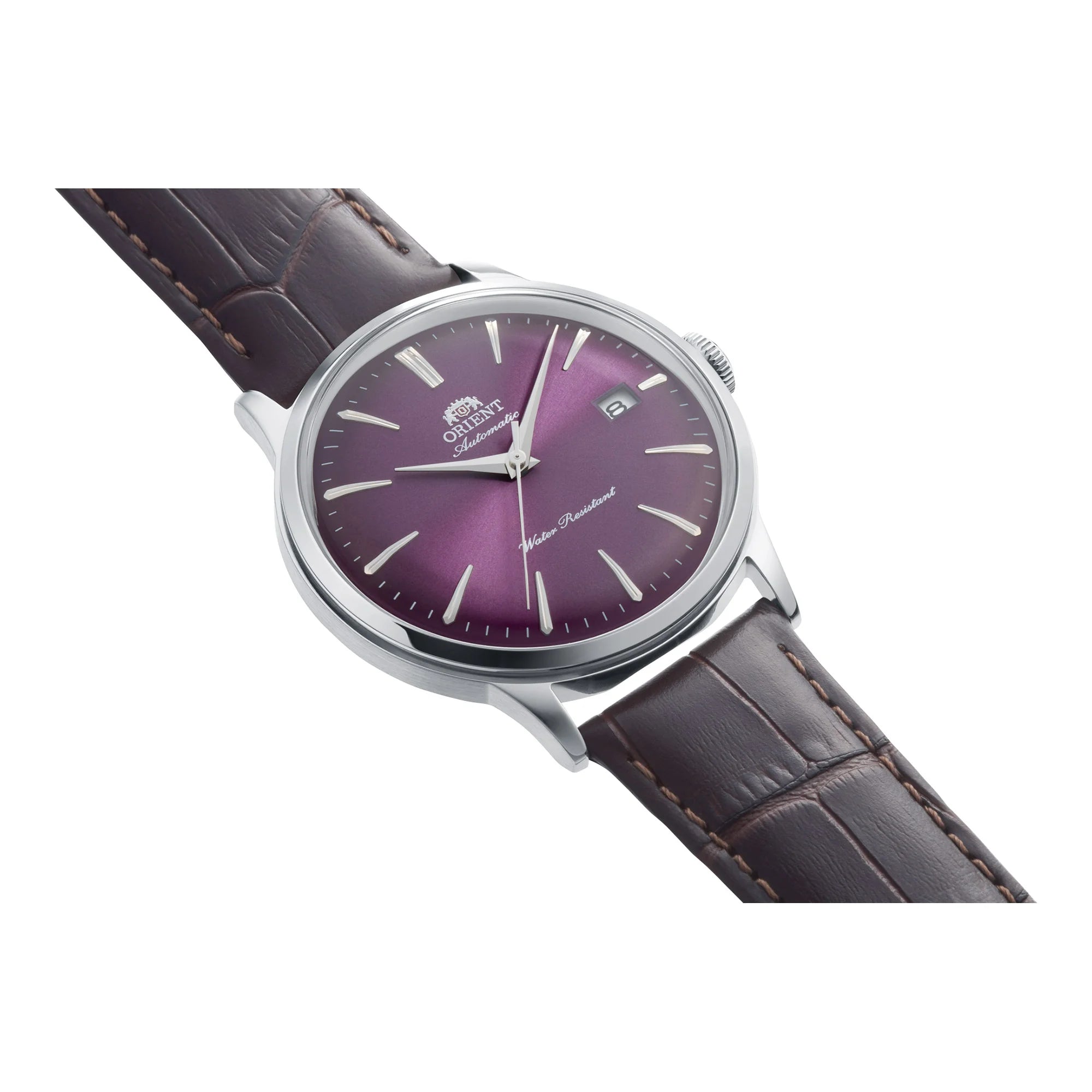 The RA-AC0032V Ametista variant features a striking 40mm round stainless steel case in a refined silver-grey, perfectly complemented by a rich chocolate brown leather strap with a secure tang buckle. Its captivating claret violet dial, visible through a durable mineral crystal, offers a sophisticated touch that embodies classic watch design. The transparent snap-on case back provides a fascinating view of the intricate movement within.