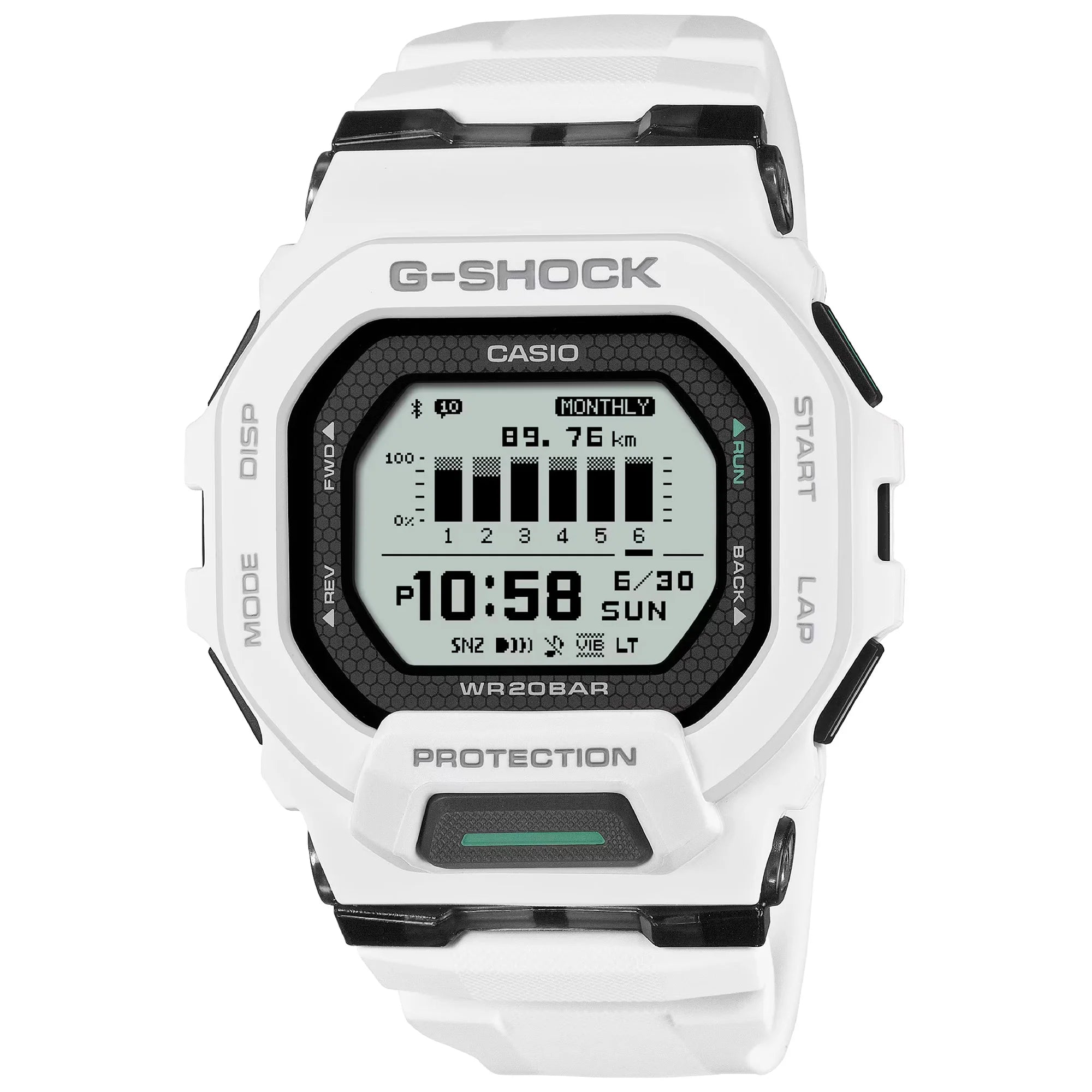 The striking **white resin case** and matching band provide a fresh, sporty look, while its **squared 46mm design** houses a clear **black LCD digital dial**. Built to endure, the GBD-200-7ER boasts **200m diver's water resistance** and is **shock-resistant**, ensuring reliability in the toughest conditions. Its lightweight 58g construction ensures comfort during intense workouts.