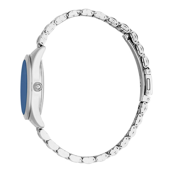 Im Bereich von Eleganz und Raffinesse erscheint die Just Cavalli Luna Uhr als ein Leuchtturm von Stil und Anmut. Gefertigt im Herzen der Mode, ist diese exquisite Uhr aus der Just Cavalli Glam Chic Kollektion ein Beweis für das Engagement der Marke für Luxus und Innovation. Entworfen für die moderne Frau, die Selbstbewusstsein und Charme ausstrahlt, fesselt die Luna Uhr mit ihrem runden, silbergrauen Gehäuse, das perfekt zu ihrem schlanken Edelstahlarmband passt. Die Faltschließe mit Druckknopf sorgt für einen sicheren und bequemen Sitz und macht sie zu einem idealen Begleiter für jeden Anlass. Das nachtblau Zifferblatt, das an einen sternenklaren Himmel erinnert, verleiht einen Hauch von Geheimnis und Reiz, während das Quarzwerk und die Drei-Zeiger-Anzeige Präzision und Zuverlässigkeit versprechen. Wasserbeständig und mit einem Mineralglas versehen, ist diese Uhr ebenso praktisch wie schön. Das raffinierte Design und die Liebe zum Detail machen sie zu einem unverzichtbaren Accessoire für diejenigen, die die schönen Dinge im Leben schätzen. Mit seiner harmonischen Verbindung von Mode und Funktion ist die Just Cavalli Luna Uhr nicht nur eine Uhr, sondern ein Statement von Stil und Raffinesse, das Trends und Zeit überdauert.