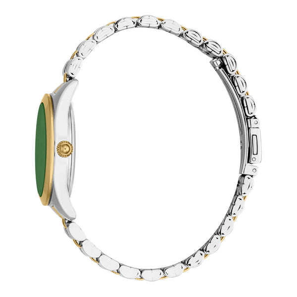 Im Bereich der Zeitmesser, wo Eleganz auf Kühnheit trifft, entsteht eine Kreation, die das Wesen von Raffinesse und Stil einfängt. Gefertigt im Herzen der Mode, ist diese Just Cavalli Uhr aus der Glam Chic Kollektion ein Zeugnis für das Engagement der Marke für mutiges Design und verfeinerte Ästhetik. Das runde Gehäuse, getaucht in einen luxuriösen Gelbgoldton, strahlt eine Aura von Opulenz aus und ergänzt perfekt das Edelstahlarmband, das dieselbe goldene Anziehungskraft widerspiegelt. Mit einem Gehäusedurchmesser von 32 mm sitzt sie anmutig am Handgelenk, eine subtile, aber auffällige Aussage für modebewusstes Denken. Das flaschengrüne Zifferblatt, das an tiefe, üppige Wälder erinnert, verleiht einen Hauch von Geheimnis und Tiefe und zieht mit seinem fesselnden Farbton die Blicke auf sich. Unter seiner Mineralglasoberfläche sorgt das Quarzwerk für Präzision und Zuverlässigkeit, während die 3-Zeiger-Anzeige diesem modernen Meisterwerk eine klassische Note verleiht. Die Faltschließe mit Druckknopfverschluss gewährleistet einen sicheren Sitz und verbindet Funktionalität mit Stil. Wasserbeständig ist diese Uhr dafür konzipiert, die moderne Frau auf ihren Lebensabenteuern zu begleiten, sei es beim Navigieren durch den urbanen Dschungel oder beim Besuch einer glamourösen Soiree. Mit ihrer Pull & Push Krone wird das Einstellen der Zeit zu einer mühelosen Aufgabe, die es der Trägerin ermöglicht, sich auf das Wesentliche zu konzentrieren: ein Statement zu setzen. Diese Just Cavalli Uhr ist nicht nur ein Zeitmesser, sondern eine Verkörperung gewagter Eleganz, ein Spiegelbild des einzigartigen Charakters und des unbeugsamen Geistes der Trägerin.