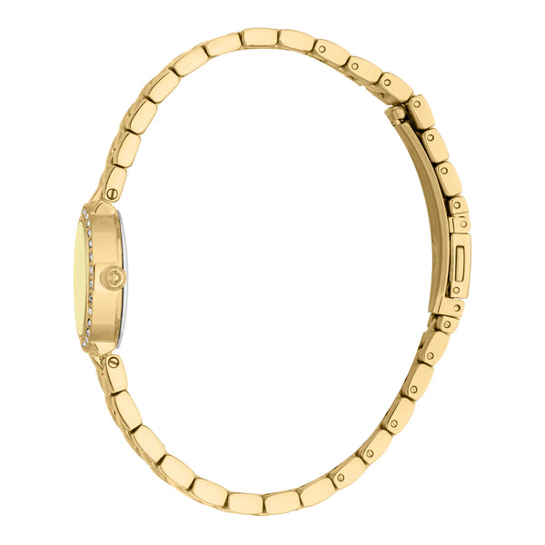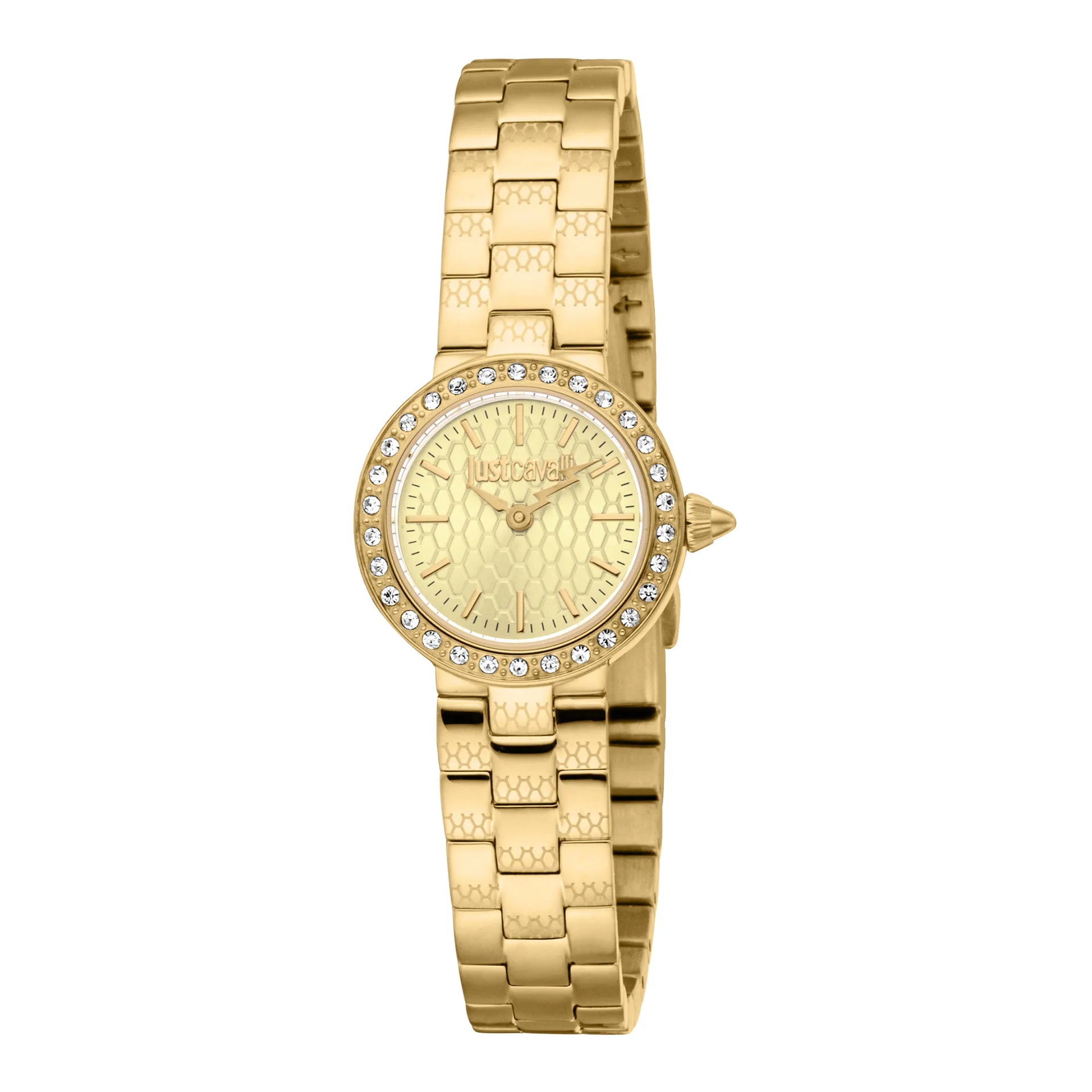 In der Welt der Mode, in der Eleganz auf Kühnheit trifft, entsteht eine Uhr, die das Wesen von Raffinesse und Stil einfängt. Gefertigt im Herzen der Schweizer Uhrmacherkunst, ist diese Just Cavalli Uhr aus der Glam Chic Kollektion ein Zeugnis für verfeinertes Design und exquisite Handwerkskunst. Ihr rundes Gehäuse, getaucht in den warmen Glanz von Gelbgold, misst zarte 23 mm und ist damit ein perfekter Begleiter für die moderne Frau, die sowohl Anmut als auch Funktionalität schätzt. Das champagnerfarbene Zifferblatt, das an einen goldenen Sonnenuntergang erinnert, verleiht einen Hauch von Opulenz, während das Zwei-Zeiger-Quarzwerk Präzision und Zuverlässigkeit gewährleistet. Das Mineralglas schützt das Zifferblatt und bietet Klarheit und Haltbarkeit, während die Pull & Push Krone eine einfache Einstellung ermöglicht. Das Edelstahlarmband, ebenfalls in Gelbgold, schmiegt sich mit einem Gefühl von Luxus um das Handgelenk und wird durch eine Faltschließe mit Druckknopf für zusätzlichen Komfort gesichert. Mit einer Wasserdichtigkeit von bis zu 50 Metern ist diese Uhr nicht nur ein Mode-Statement, sondern ein vielseitiges Accessoire für jeden Anlass. Ihre schimmernde Präsenz und das elegante Design machen sie zu einem Must-have für diejenigen, die es wagen, aufzufallen, und verkörpert den Geist der mutigen und schicken Ästhetik von Just Cavalli.