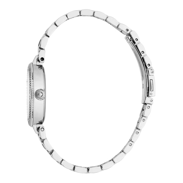 Im Bereich der Mode, wo Eleganz auf Kühnheit trifft, entsteht eine Uhr, die das Wesen von Raffinesse und Stil verkörpert. Diese Just Cavalli Watch aus der illustren Glam Chic Kollektion ist ein Zeugnis für das Engagement der Marke, Stücke zu schaffen, die sowohl zeitlos als auch zeitgemäß sind. Gefertigt in einer verfeinerten runden Form, strahlt das silbergraue Gehäuse eine subtile, aber auffällige Anziehungskraft aus, die perfekt zum Edelstahlarmband passt, das sich mit Anmut und Haltung um das Handgelenk legt. Die Schmetterlings-Faltschließe mit Druckknopf sorgt für eine nahtlose Passform und verleiht dem klassischen Design einen Hauch von modernem Komfort. Das Zifferblatt in harmonischem Silbergrau ist eine Leinwand zurückhaltender Eleganz, auf der das Drei-Zeiger-Quarzwerk mit Präzision und Zuverlässigkeit tanzt. Mit einer Wasserdichtigkeit von bis zu 50 Metern ist diese Uhr nicht nur ein Mode-Statement, sondern ein vielseitiger Begleiter für die moderne Frau. Das Mineralglas fügt eine Schicht Haltbarkeit hinzu, schützt die filigranen Merkmale der Uhr und bewahrt gleichzeitig ihre verfeinerte Ästhetik. Diese Just Cavalli Watch ist mehr als ein Accessoire, sie ist eine Feier der Weiblichkeit und Mode, ein Stück, das zu den Mutigen und Schönen spricht und den Geist derjenigen einfängt, die es wagen, in einer Welt der Konformität aufzufallen.