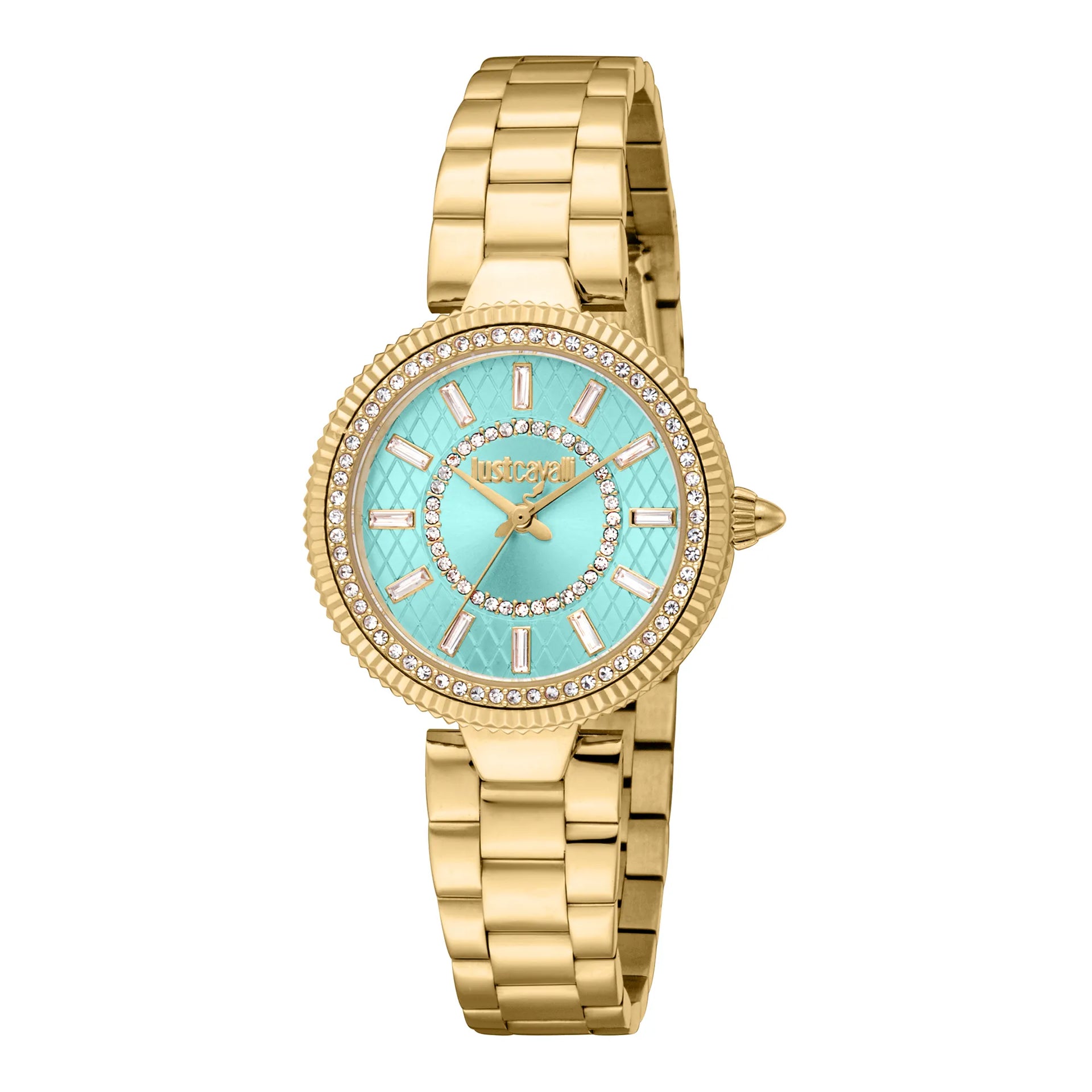 Im Bereich der Mode, wo Eleganz auf Kühnheit trifft, entsteht eine Uhr, die das Wesen von Glamour und Raffinesse einfängt. Diese Just Cavalli Uhr aus der illustren Glam Chic Kollektion ist ein Zeugnis für das Engagement der Marke für Stil und Innovation. Gefertigt in einer edlen runden Form, strahlt das Gehäuse in einem luxuriösen Gelbgoldton und ergänzt perfekt das Edelstahlarmband, das sich mit einer nahtlosen Butterfly-Faltschließe um das Handgelenk legt. Das türkisfarbene Zifferblatt der Uhr, ein lebendiger Farbtupfer, verleiht einen modernen Akzent und macht sie zum idealen Accessoire für diejenigen, die es wagen, aufzufallen. Mit einem Gehäusedurchmesser von 30 mm findet sie die perfekte Balance zwischen Zurückhaltung und Statement, während das Mineralglas für Haltbarkeit und Klarheit sorgt. Bis zu 50 Meter wasserdicht, ist diese Uhr ebenso praktisch wie stilvoll und bereit, Sie auf den Abenteuern des Lebens zu begleiten. Die Pull-&-Push-Krone und das Quarzwerk gewährleisten Präzision und einfache Handhabung, während die Drei-Zeiger-Anzeige einen klassischen Touch bietet. Für die modebewusste Frau entworfen, ist diese Uhr mehr als nur ein Zeitmesser, sie ist ein Ausdruck von Individualität und Selbstbewusstsein, ein Spiegelbild des mutigen Geistes, der die Marke Just Cavalli definiert.