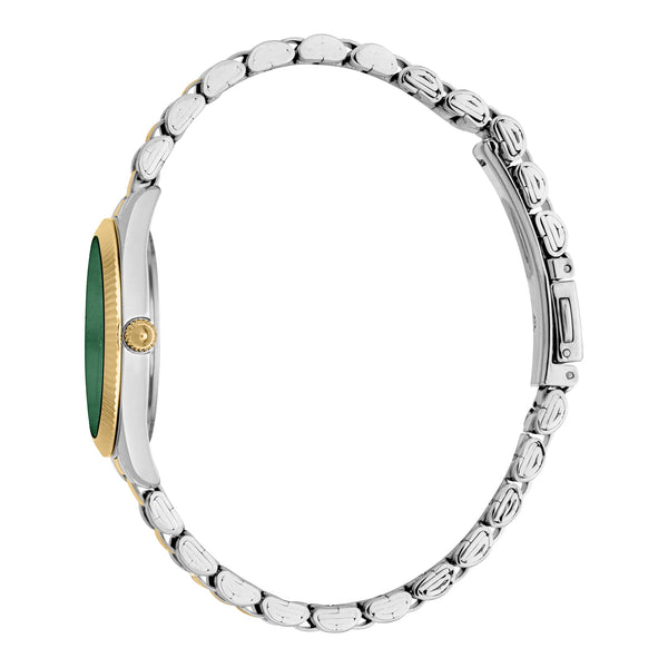 Umarmen Sie die lebendige Eleganz der Just Cavalli Pacentro, ausgestattet mit einem runden Gehäuse aus Gelbgold und einem flaschengrünen Zifferblatt. Diese atemberaubende Uhr mit ihrem Edelstahlarmband und der Butterfly-Faltschließe ist für diejenigen gefertigt, die mutigen Stil und Raffinesse schätzen.