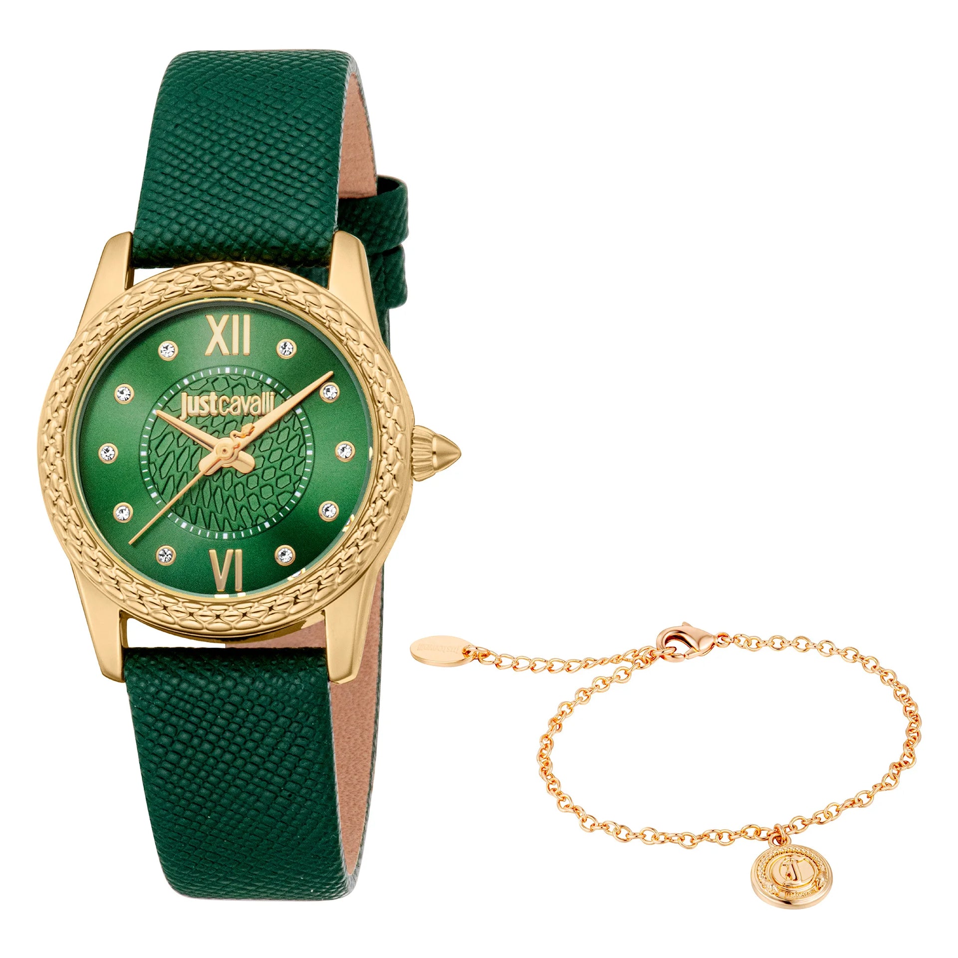 Im Bereich der Mode, wo Eleganz auf Kühnheit trifft, entsteht eine Uhr, die das Wesen von Raffinesse und Mut einfängt. Gefertigt im Herzen der Schweizer Uhrmacherkunst, ist diese Just Cavalli Uhr aus der JC1L360 Sublime Animalier Kollektion ein Zeugnis für verfeinertes Design und exquisiten Geschmack. Das runde Gehäuse, getaucht in einen luxuriösen Gelbgoldton, strahlt eine Aura von Opulenz aus und ergänzt perfekt das lebendige Flaschengrün des Lederbands. Diese harmonische Farbkombination schafft einen auffälligen visuellen Kontrast und macht sie zu einem echten Statement-Stück für die moderne Frau. Das Zifferblatt, ebenfalls in einem fesselnden Flaschengrün, ist eine Leinwand der Eleganz, auf der die Drei-Zeiger-Anzeige anmutig unter dem Schutz eines Mineralglases tanzt. Mit einem Gehäusedurchmesser von 30 mm sitzt sie zart am Handgelenk und bietet sowohl Komfort als auch Stil. Die Dornschließe sorgt für einen sicheren Sitz, während die Pull & Push Krone dem Design einen Hauch von Praktikabilität verleiht. Wasserbeständig und angetrieben von präzisem Quarzwerk ist diese Uhr nicht nur ein Accessoire, sondern ein Begleiter für jedes Abenteuer. Umarmen Sie den Reiz der Mode mit diesem exquisiten Zeitmesser, bei dem jeder Blick auf Ihr Handgelenk an das Kühne und Schöne erinnert.