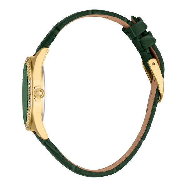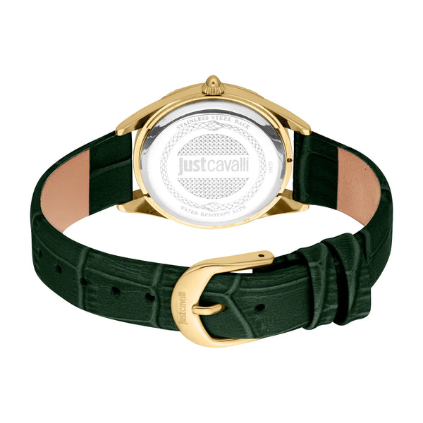 Im Bereich der Mode, wo Eleganz auf Kühnheit trifft, entsteht eine Uhr, die das Wesen moderner Raffinesse einfängt—die Just Cavalli Watch. Gefertigt im Herzen des Stils, ist dieses exquisite Stück aus der JC1L361 Vittoria Glam Kollektion ein Zeugnis für das Engagement der Marke für mutiges Design und verfeinerte Ästhetik. Das runde Gehäuse, getaucht in einen luxuriösen Gelbgoldton, strahlt eine Aura von Opulenz aus und ergänzt perfekt das lebendige Flaschengrün des Zifferblatts, das dem Ensemble einen Hauch von auffälligem Flair verleiht. Dieser auffällige Kontrast wird durch das geschmeidige Lederarmband, ebenfalls in Flaschengrün, weiter verstärkt, das sich mit Anmut und Selbstbewusstsein um das Handgelenk legt. Die Dornschließe sorgt für einen sicheren Sitz, während das Mineralglas einen klaren Blick auf das präzise Quarzwerk darunter bietet. Mit einem Gehäusedurchmesser von 32 mm ist diese Uhr für die modebewusste Frau konzipiert, die die feinen Dinge im Leben schätzt. Wasserbeständig und mit einer Pull & Push-Krone ausgestattet, verbindet sie nahtlos Funktionalität mit Stil. Die Drei-Zeiger-Anzeige markiert elegant den Verlauf der Zeit und macht sie nicht nur zu einer Uhr, sondern zu einem Statement von Individualität und Charakter. Ob zu einem glamourösen Event getragen oder als Alltagsaccessoire, diese Just Cavalli Watch ist eine Feier von Kühnheit und Eleganz, ein wahrer Ausdruck des kühnen Geistes, den sie verkörpert.