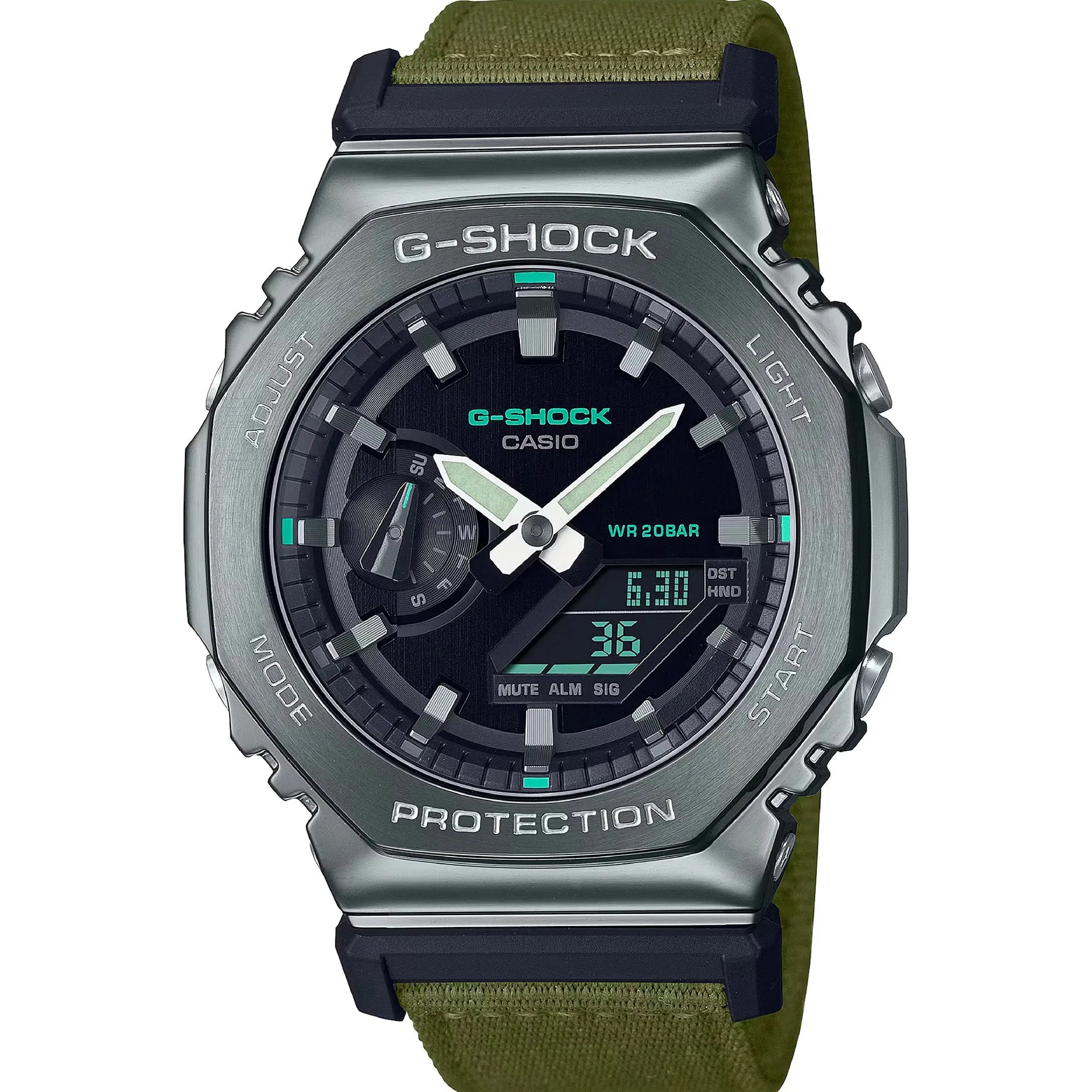 Die CASIO G-Shock Military Uhr, mit ihrem silbergrauen sechseckigen Gehäuse, verkörpert zeitlose Raffinesse. Kombiniert mit einem olivgrünen Stoffarmband bietet sie einen auffälligen Kontrast. Ihre 200m Wasserdichtigkeit stellt sicher, dass sie ebenso funktional wie stilvoll ist.