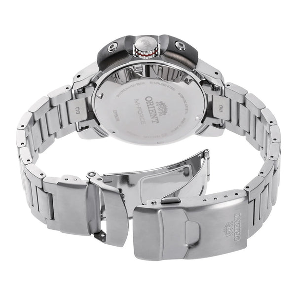 Im Bereich der Zeitmesser, wo Präzision auf Leidenschaft trifft, entsteht eine Kreation, die den Geist des Abenteuers und den Reiz des Unbekannten verkörpert. In Japan gefertigt, ist die ORIENT AC0L M-Force ein Zeugnis für das Engagement der Marke für Exzellenz und Innovation. Diese Uhr, ein stolzes Mitglied der ORIENT Sports Familie, ist für den modernen Mann konzipiert, der Herausforderungen liebt und den Nervenkitzel der Natur sucht. Ihr rundes Gehäuse, gehüllt in ein elegantes Schwarz, zieht mit einem markanten Durchmesser von 47 mm alle Blicke auf sich und setzt ein mutiges Statement an jedem Handgelenk. Das lebendige orangefarbene Zifferblatt, eine Anspielung auf den gewagten Stil der Popkultur, fügt einen Farbtupfer hinzu, der fesselt und fasziniert. Unter dem Saphirglas schlägt das Herz dieses Zeitmessers mit der Präzision eines mechanischen Uhrwerks, angetrieben vom Kaliber F6727 mit 22 Steinen, das eine Genauigkeit mit einer täglichen Abweichung von +25/-15 Sekunden gewährleistet. Das Edelstahlarmband in einem eleganten Silbergrau ergänzt die dynamische Ästhetik der Uhr und ist mit einer Faltschließe mit Druckknopf und Sicherheitsverschluss für zusätzliche Sicherheit versehen. Mit einer Wasserdichtigkeit von bis zu 200 Metern ist diese Taucheruhr bereit, Sie bei Unterwassererkundungen zu begleiten, während die verschraubte Krone ihre Haltbarkeit sicherstellt. Der Datumsanzeiger und die 3-Zeiger-Anzeige bieten Praktikabilität, ohne den Stil zu beeinträchtigen. Ob von Hand aufgezogen oder automatisch, die ORIENT AC0L M-Force ist ein Meisterwerk des raffinierten Designs, ein Symbol für Widerstandsfähigkeit und Eleganz, das die Zeit überdauert.