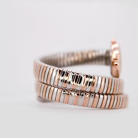 Crafted with meticulous attention to detail, this Just Cavalli women's watch features an alluring oval 22mm rose gold IP plated stainless steel case, perfectly complemented by a radiant rose gold dial. The distinctive design extends to the bracelet, a stunning combination of silver grey and rose gold IP plated stainless steel, showcasing the signature snake motif that defines this unique collection. With a comfortable 12mm band width and durable mineral crystal, this timepiece is not just an accessory, but a work of art.