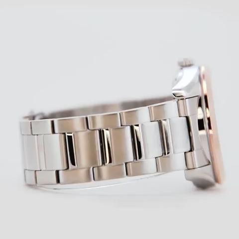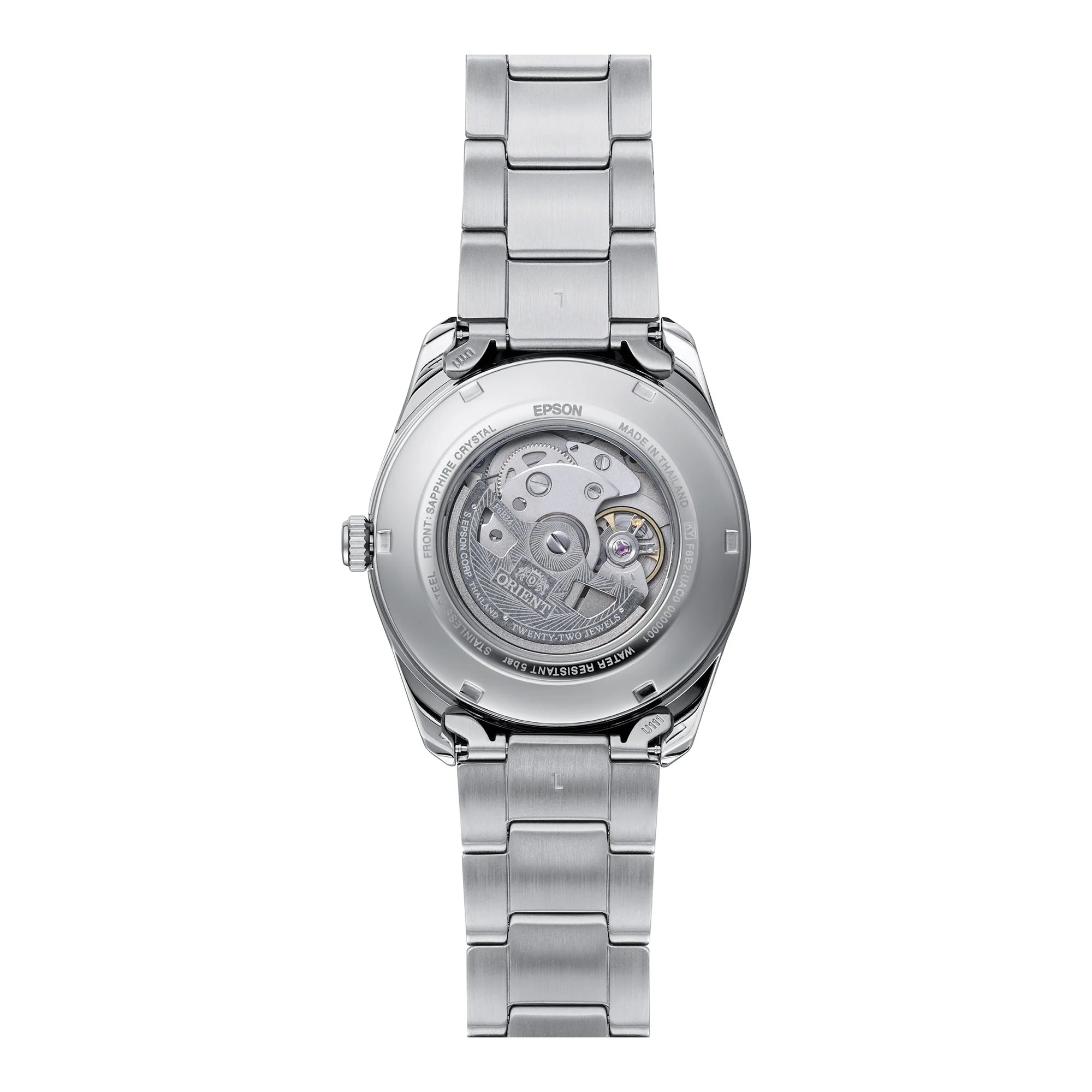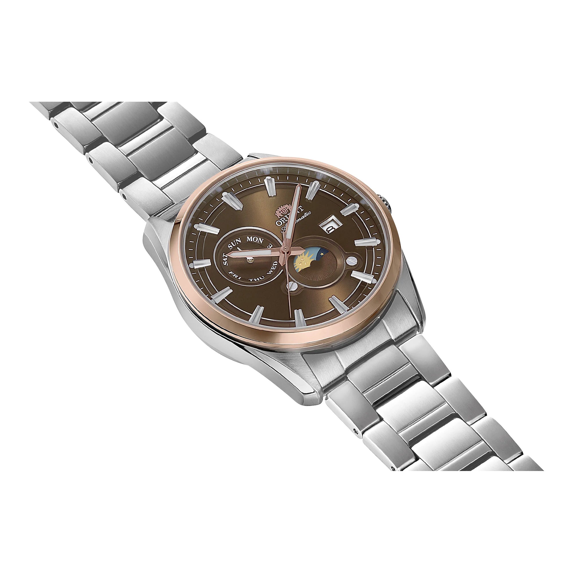At its heart beats the in-house ORIENT F6B24 mechanical movement. This 22-jewel caliber boasts automatic and hand-winding capabilities, along with hacking for precise time setting. With a daily accuracy of +25/-15 seconds, the reliable F6B24 ensures consistent performance. It features a convenient Day & Date calendar display and a unique Day & Night indicator, adding practical charm to its fawn brown dial. The transparent screw-down case back offers a captivating view of the intricate mechanics.