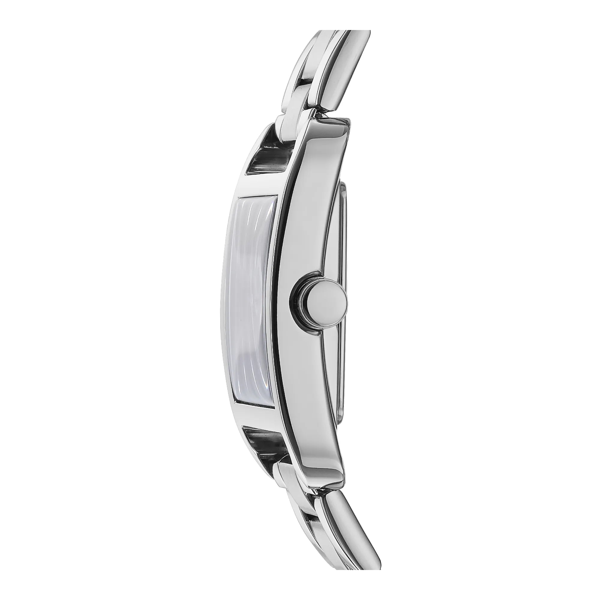 Im pulsierenden Herzen der Stadt, wo Mode auf Funktion trifft, erscheint die DKNY DK1L001 City Maxi Uhr als ein Statement von Eleganz und Modernität. Mit einem raffinierten Design gefertigt, fängt diese Uhr das Wesen urbaner Raffinesse ein. Ihr schlankes rechteckiges Gehäuse, getaucht in einen silbergrauen Farbton, strahlt einen zeitlosen Charme aus, der das lebendige fuchsienfarbene Zifferblatt ergänzt und jedem Outfit einen Farbtupfer verleiht. Das Zifferblatt mit seiner Drei-Zeiger-Anzeige ist ein Zeugnis für die Präzision des Quarzuhrwerks und stellt sicher, dass die Zeit immer auf Ihrer Seite ist. Eingefasst in Mineralglas ist die Uhr nicht nur ein Modeaccessoire, sondern auch ein zuverlässiger Begleiter, der Wasserdichtigkeit für unerwartete Stadtduschen bietet. Das Edelstahlarmband, das in seiner silbergrauen Eleganz zum Gehäuse passt, schmiegt sich mit einer Butterfly-Faltschließe um das Handgelenk und bietet sowohl Sicherheit als auch Stil. Der Druckknopfmechanismus fügt eine praktische Note hinzu, die das Tragen und Abnehmen erleichtert. Entworfen für die moderne Frau, die die Stadt mit Anmut und Selbstvertrauen navigiert, ist diese DKNY Uhr mehr als nur ein Zeitmesser, sie ist ein Ausdruck von Individualität und Flair. Ob Sie an einem hochkarätigen Meeting teilnehmen oder einen entspannten Brunch genießen, die DKNY City Maxi Uhr ist Ihr perfekter Partner, der die lebendige Energie der Stadt und den mutigen Geist ihrer Trägerin widerspiegelt.