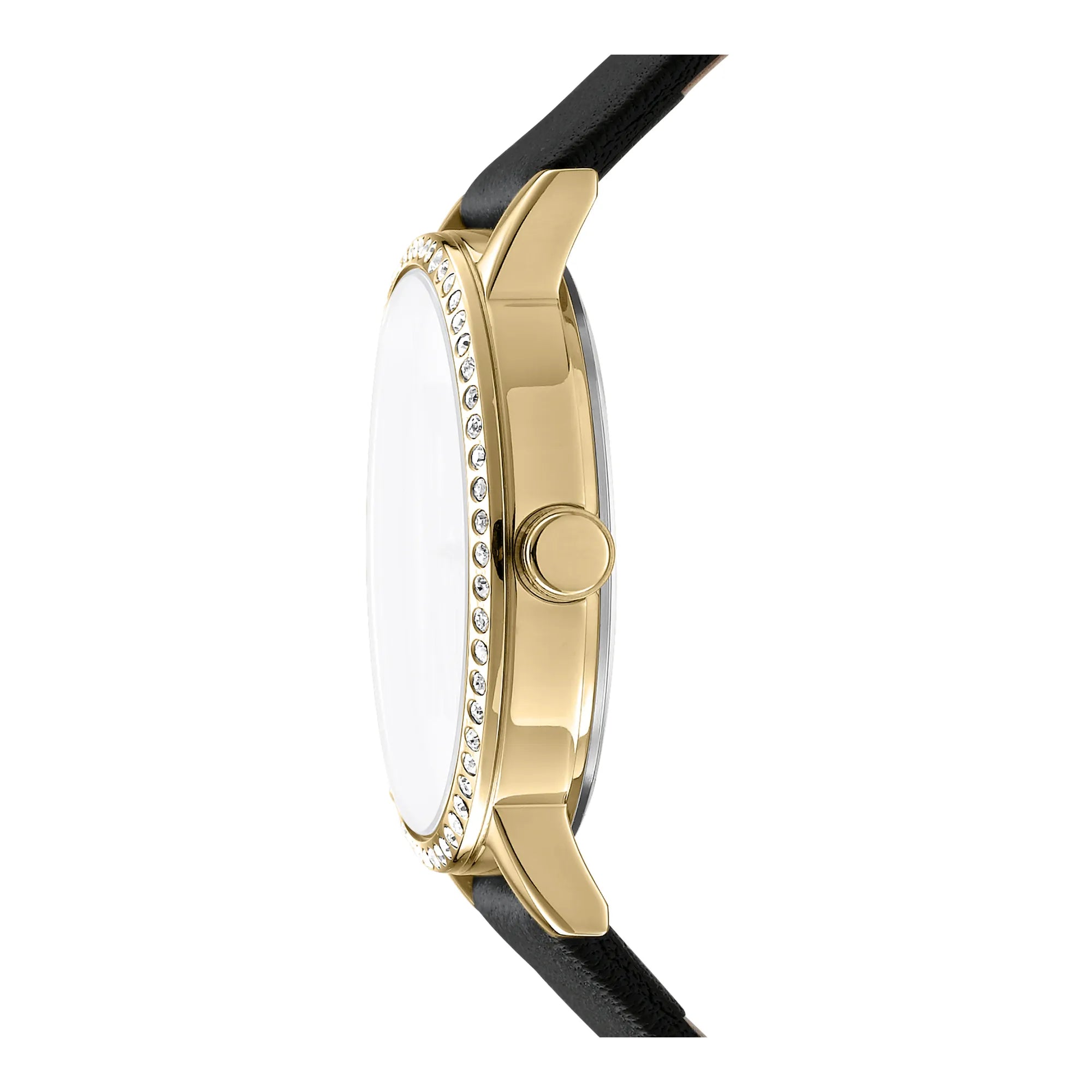 Im pulsierenden Herzen von New York City, wo Mode auf Funktion trifft, entsteht eine Uhr, die den Geist urbaner Eleganz verkörpert. Die DKNY DK1L035 Soho Logo Uhr ist ein Zeugnis für den dynamischen Lebensstil der modernen Frau und verbindet nahtlos Raffinesse mit Praktikabilität. Ihr rundes Gehäuse, getaucht in einen luxuriösen Gelbgoldton, fängt das Wesen zeitlosen Glamours ein, während der Durchmesser von 36 mm ein perfektes Gleichgewicht zwischen Kühnheit und Zurückhaltung gewährleistet. Mit einem raffinierten Design gefertigt, ist diese Uhr bis zu 50 Meter wasserdicht und somit ebenso vielseitig wie stilvoll. Das Mineralglas schützt ein silbergraues Zifferblatt, auf dem drei Zeiger anmutig tanzen, angetrieben von einem präzisen Quarzwerk. Die Pull & Push-Krone verleiht einen Hauch klassischen Charmes und lädt dazu ein, die Zeit mühelos einzustellen. Ein schwarzes Lederarmband, gesichert mit einer Dornschließe, schmiegt sich bequem ums Handgelenk und bietet einen eleganten Kontrast zum goldenen Gehäuse. Dieses modische Accessoire ist mehr als nur eine Uhr, es ist ein Statement von Individualität und Anmut, entworfen für die Frau, die die Welt mit Selbstvertrauen und Gelassenheit navigiert. Ob Sie an einem wichtigen Meeting teilnehmen oder einen entspannten Brunch genießen, diese DKNY Uhr ist der perfekte Begleiter und spiegelt die lebendige Energie und Raffinesse der Stadt wider, die niemals schläft.