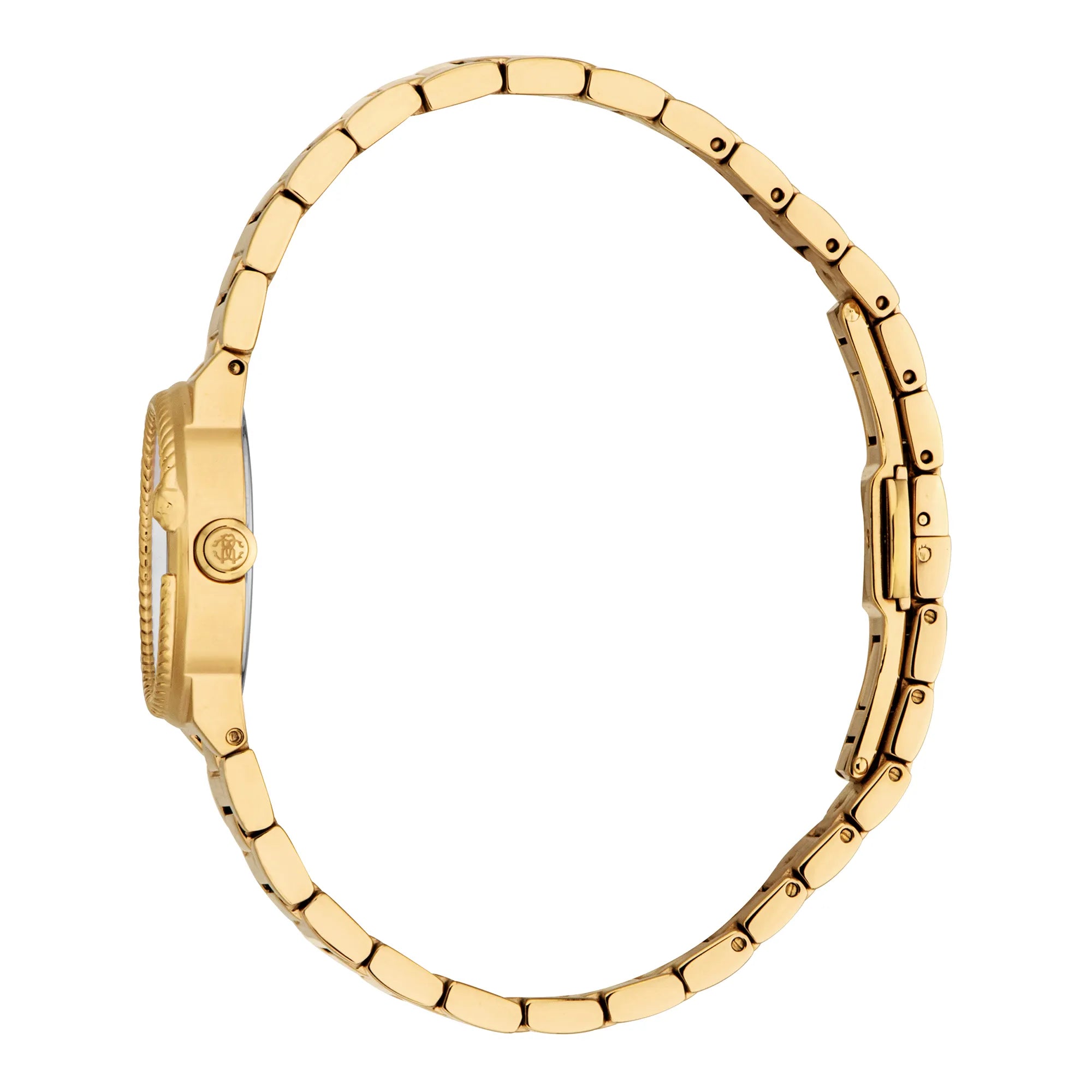 Strahlen Sie Opulenz mit der Roberto Cavalli Lady Uhr aus, die ein rundes Gehäuse und Armband aus Gelbgold besitzt. Das silbergraue Zifferblatt setzt einen Kontrastakzent, während die Schmetterlings-Faltschließe und die Wasserbeständigkeit dieses Stück ebenso praktisch wie luxuriös machen.