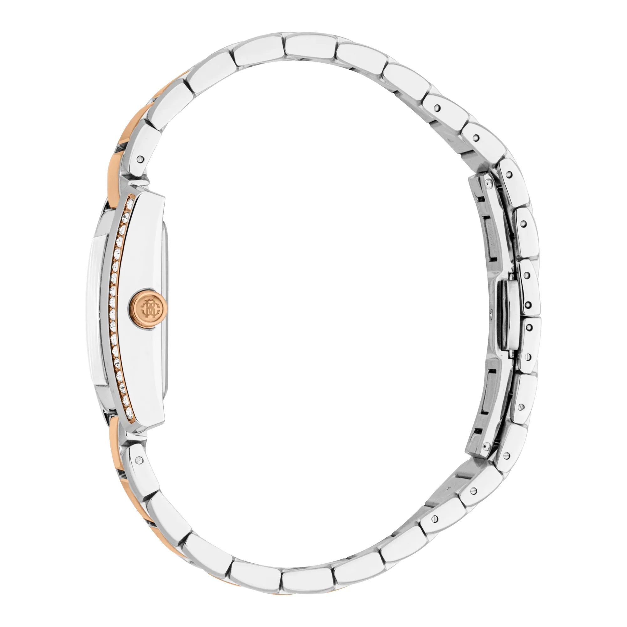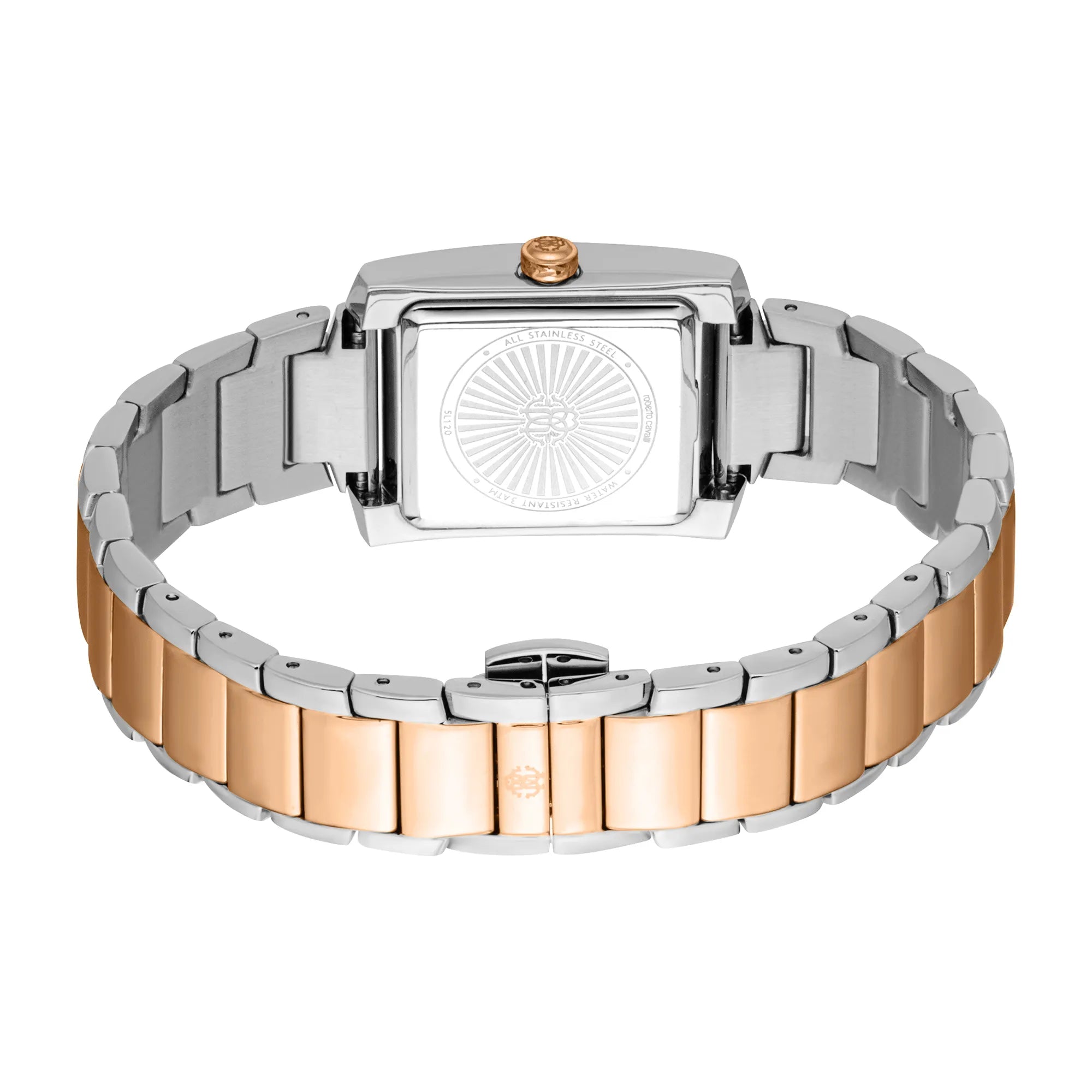 Genießen Sie den zarten Charme der Roberto Cavalli Lady Uhr. Ein silbergraues rechteckiges Gehäuse und ein silbergraues Zifferblatt werden wunderschön durch ein roségoldfarbenes Edelstahlarmband ergänzt. Die Schmetterlings-Faltschließe sorgt für Komfort, während Wasserbeständigkeit und ein Mineralglas zu ihrem edlen Reiz beitragen.