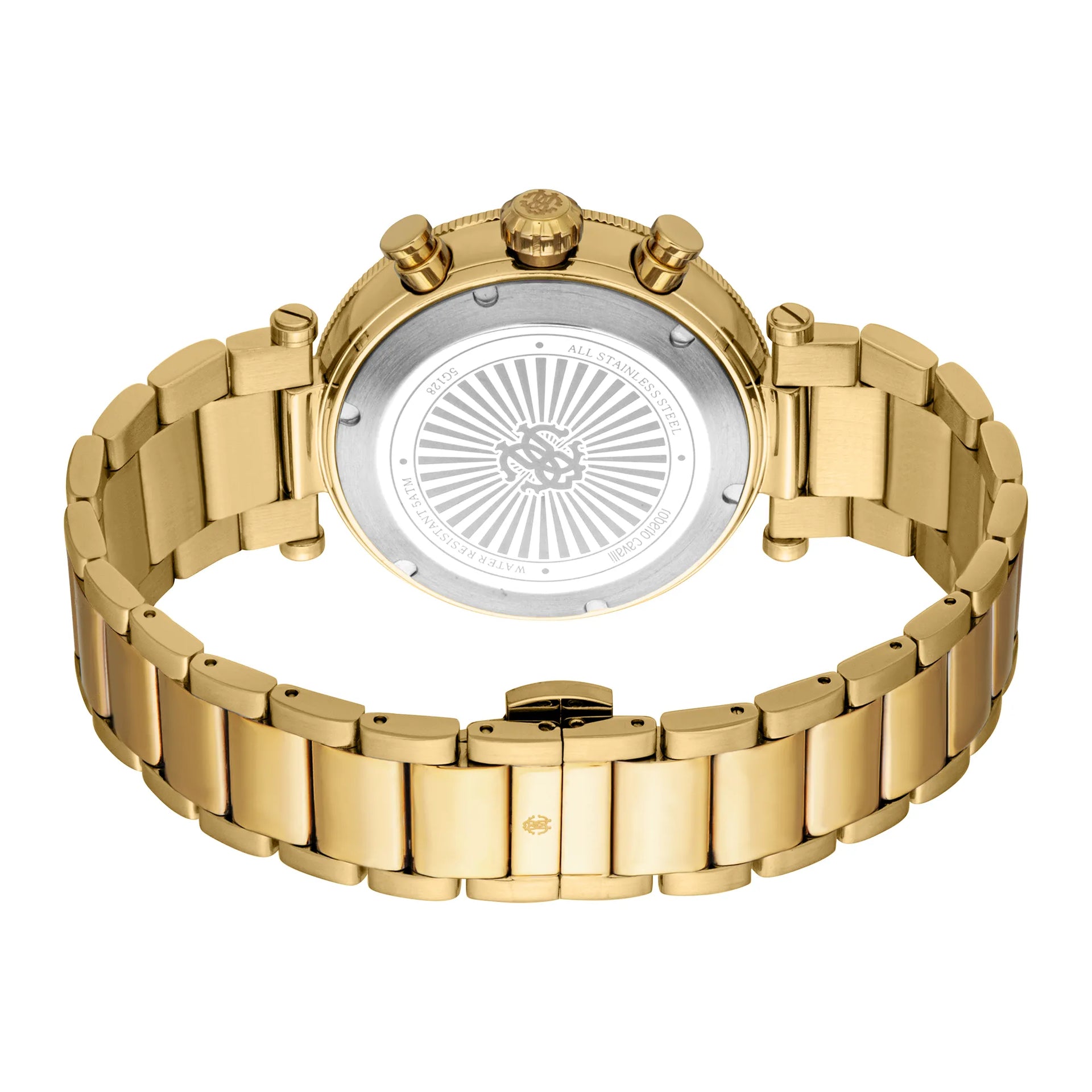 In der Welt der Uhrmacherkunst, wo Eleganz auf Präzision trifft, entsteht eine Uhr, die das Wesen von Raffinesse und Stil verkörpert. Gefertigt im Herzen der Schweizer Uhrmacherei, ist diese Roberto Cavalli Gent Uhr ein Zeugnis für das Engagement der Marke für Luxus und Innovation. Ihr rundes Gehäuse, getaucht in den Glanz von Gelbgold, zieht mit einem Durchmesser von 43 mm alle Blicke auf sich und setzt ein mutiges Statement am Handgelenk des anspruchsvollen Gentlemans. Das Mineralglas schützt ein auffälliges schwarzes Zifferblatt, auf dem die Kunst der Zeitmessung mit einer Chronographenanzeige und einem Datums-Kalender auf ein neues Niveau gehoben wird, angetrieben vom zuverlässigen JS25 Quarzwerk. Das raffinierte Design der Uhr wird durch ein Edelstahlarmband, ebenfalls in Gelbgold, weiter betont, das nahtlos mit einer Butterfly-Faltschließe mit Druckknopf für sicheren und mühelosen Tragekomfort integriert ist. Bis zu 100 Meter wasserdicht, ist diese Uhr so vielseitig wie elegant und bereit, ihren Träger vom Konferenzraum bis in die Tiefen des Ozeans zu begleiten. Die Pull & Push-Krone verleiht einen Hauch klassischen Charmes, während die 24-Stunden-Zeitanzeige sicherstellt, dass jeder Moment präzise erfasst wird. Diese Roberto Cavalli Uhr ist nicht nur ein Accessoire, sondern ein Statement für Mode und Funktionalität, ein Spiegelbild des modernen Mannes Wunsch nach Exzellenz und Stil.