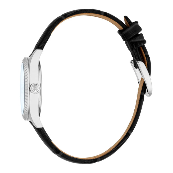 Hellblau trifft auf silbergrau in dieser Roberto Cavalli Lady Uhr, eine zarte Balance aus Eleganz und Modernität. Das 28mm runde Gehäuse und das schwarze Lederarmband, befestigt mit einer Dornschließe, bieten eine raffinierte Note. Mit WR 50mt Wasserdichtigkeit ist sie ebenso praktisch wie schön.