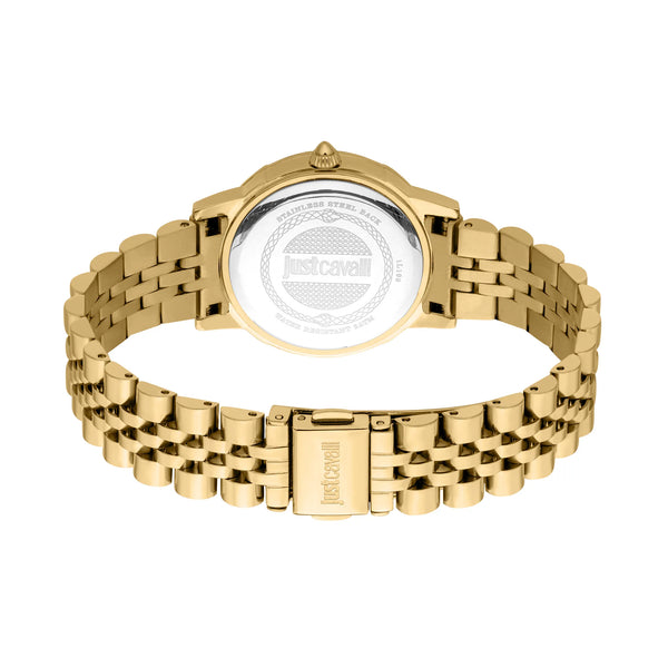 Im Reich zeitloser Eleganz, wo Mode auf Funktion trifft, entsteht ein Meisterwerk, das die Essenz von Raffinesse und Stil einfängt. Diese Just Cavalli Uhr aus der berühmten Just Cavalli Glam Chic Kollektion ist ein Zeugnis für das Engagement der Marke für exquisites Design und unvergleichliche Handwerkskunst. Gefertigt in einem strahlenden Gelbgoldton, strahlt das runde Gehäuse mit einem Durchmesser von 32 mm einen luxuriösen Charme aus, der sowohl kühn als auch raffiniert ist. Das Edelstahlarmband, ebenfalls in passendem Gelbgold, schmiegt sich mit nahtloser Anmut ums Handgelenk und wird durch eine Butterfly-Faltschließe mit Druckknopf für Komfort und Benutzerfreundlichkeit gesichert. Das silbergraue Zifferblatt, eine Leinwand zurückhaltender Eleganz, ist mit drei Zeigern und einem Datumsanzeiger versehen, angetrieben von der Präzision eines Quarzwerks mit VJ32 Kaliber. Diese Uhr ist nicht nur ein Zeitmesser, sondern ein Statement für modebewusstes Denken, perfekt für die moderne Frau, die die schönen Dinge des Lebens schätzt. Wasserresistent und geschützt durch ein Mineralglas, ist sie darauf ausgelegt, den Strapazen des täglichen Gebrauchs standzuhalten und dabei ihre makellose Ausstrahlung zu bewahren. Die Pull & Push Krone verleiht einen Hauch von Praktikabilität und stellt sicher, dass diese Uhr ebenso funktional wie schön ist. Mit ihrem silbergrauen Akzent vor dem goldenen Hintergrund ist diese Uhr eine Feier des zeitgenössischen Stils und macht sie zu einem unverzichtbaren Accessoire für diejenigen, die es wagen, in der Menge aufzufallen.