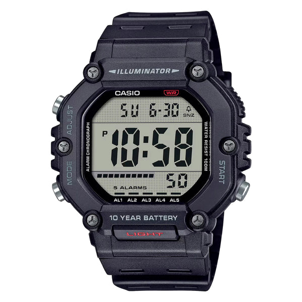 Der Innovationsgeist von Casio zeigt sich in dieser leichten schwarzen Sportuhr mit einem 50-mm-Gehäuse, LCD-Zifferblatt, Resin-Armband und zuverlässigem Quarzwerk sowie 100 m Wasserdichtigkeit für alle, die das Leben in Bewegung lieben.