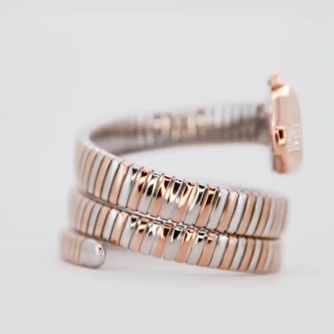 The oval, rose gold IP-plated stainless steel case, measuring 24mm in diameter and 8mm thick, is beautifully embellished with 32 brilliant zircons, capturing the mystique of the snake motif. Its captivating night blue dial features two more sparkling zircons and a clear 2-hand display, protected by a durable mineral crystal.