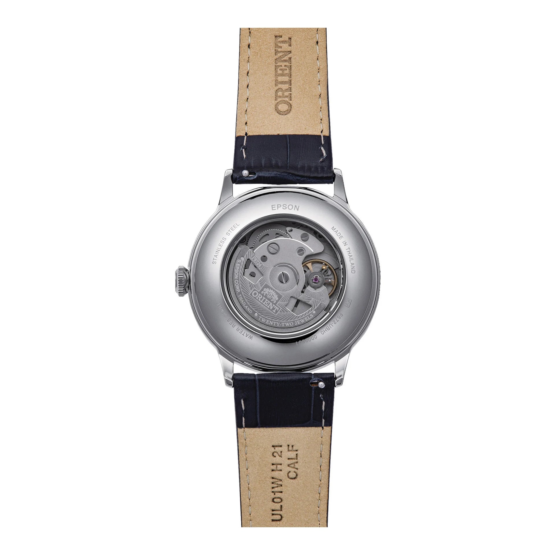 Im Reich zeitloser Eleganz erscheint die ORIENT AC00 Bambino Classic als ein Leuchtturm der Raffinesse und Präzision. Mit akribischer Liebe zum Detail gefertigt, verkörpert diese Uhr das Wesen des klassischen Stils und macht sie zu einem unverzichtbaren Accessoire für den anspruchsvollen Gentleman. Das runde Gehäuse, getaucht in einen edlen silbergrauen Farbton, umrahmt ein fesselndes nachtblaues Zifferblatt, das die Tiefen eines ruhigen Abendhimmels widerspiegelt. Diese harmonische Farbpalette erstreckt sich auf das Lederband, ebenfalls in Nachtblau, das sich bequem um das Handgelenk legt und mit einer traditionellen Dornschließe gesichert wird. Das Mineralglas bietet einen klaren Blick auf das Zifferblatt, auf dem drei Zeiger anmutig gleiten, angetrieben vom mechanischen Werk des Kalibers F6724. Mit 22 Steinen, die einen reibungslosen Betrieb gewährleisten, verspricht dieses Zeitmessgerät eine tägliche Genauigkeit von +25/-15 Sekunden, ein Zeugnis seiner präzisen Technik. Der transparente Boden offenbart den filigranen Tanz seiner automatischen und handaufgezogenen Mechanismen, ein Merkmal, das Uhrenliebhaber begeistern wird. Wasserbeständig und mit einer Pull & Push-Krone ausgestattet, ist diese Uhr ebenso praktisch wie elegant. Der Datumsanzeiger fügt eine funktionale Note hinzu, nahtlos in das Design integriert. Die ORIENT AC00 Bambino Classic ist nicht nur eine Uhr, sie ist ein Statement von raffiniertem Geschmack und zeitloser Anziehungskraft, perfekt für diejenigen, die die Kunst der Uhrmacherei schätzen.