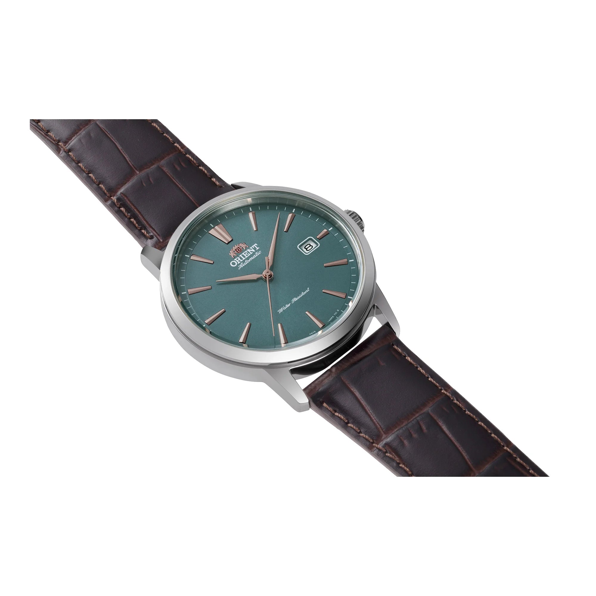 Erleben Sie zeitlose Eleganz mit der ORIENT Symphony III, einer Uhr, die für den anspruchsvollen modernen Mann gefertigt wurde. Dieses automatische Meisterwerk verbindet mühelos zeitgenössischen Freizeitstil mit anspruchsvollem Charme. Sein auffälliges opalgrünes Zifferblatt, eingefasst von einem schlanken silbernen Gehäuse und einem edlen schokoladenbraunen Lederband, ist ein Ausdruck feinen Geschmacks. Blicken Sie durch den durchsichtigen Gehäuseboden, wo das filigrane mechanische Herz schlägt – ein Zeugnis japanischer Präzision. Dies ist nicht nur ein Zeitmesser, sondern eine Erweiterung Ihrer einzigartigen Persönlichkeit, ein stilles Selbstvertrauen, mit dem Sie Ihren Tag meistern.