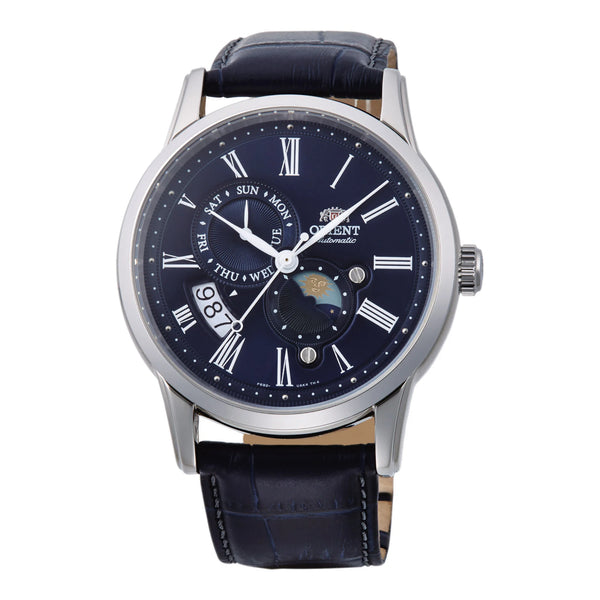 Im Bereich der Uhrmacherkunst, wo die Zeit sowohl Meister als auch Muse ist, entsteht ein Meisterwerk, das die Essenz klassischer Eleganz und mechanischer Präzision einfängt. Gefertigt im Herzen der Innovation, ist die ORIENT Classic AK00 Sun & Moon Uhr ein Zeugnis zeitloser Raffinesse. Ihr rundes Gehäuse, getaucht in einen silbergrauen Farbton, strahlt eine subtile, aber eindrucksvolle Präsenz aus, die perfekt zum tiefblauen Lederarmband passt, das das Handgelenk mit einem Gefühl von verfeinerter Luxus umschließt. Das Saphirglas enthüllt ein faszinierendes blaues Zifferblatt, auf dem der Tanz von Sonne und Mond sich entfaltet und einen poetischen Einblick in den Verlauf der Zeit bietet. Diese Uhr ist nicht nur ein Accessoire, sondern ein Statement von Stil und Substanz, entworfen für den anspruchsvollen Gentleman, der die Kunst der Uhrmacherei schätzt. Mit einem Gehäusedurchmesser von 42 mm schlägt sie eine harmonische Balance zwischen Kühnheit und Eleganz, während der transparente Boden einen Blick auf das komplexe mechanische Uhrwerk mit dem Kaliber F6B24 ermöglicht. Die 22 Steine sorgen für einen reibungslosen und präzisen Betrieb mit einer täglichen Genauigkeit von +25/-15, was sie zu einem zuverlässigen Begleiter für jeden Anlass macht. Bis zu 50 Meter wasserdicht, ist sie ebenso vielseitig wie schön und bereit, Sie von Vorstandssitzungen bis zu Abendgesellschaften zu begleiten. Die Faltschließe mit Druckknopfverschluss sorgt für einen sicheren Sitz, während die Pull & Push-Krone mühelose Einstellungen ermöglicht. Mit sowohl Handaufzug- als auch Automatikfunktionen ist diese Uhr eine Feier des Handwerks und der Innovation, eine wahre Verkörperung des ORIENT-Erbes.