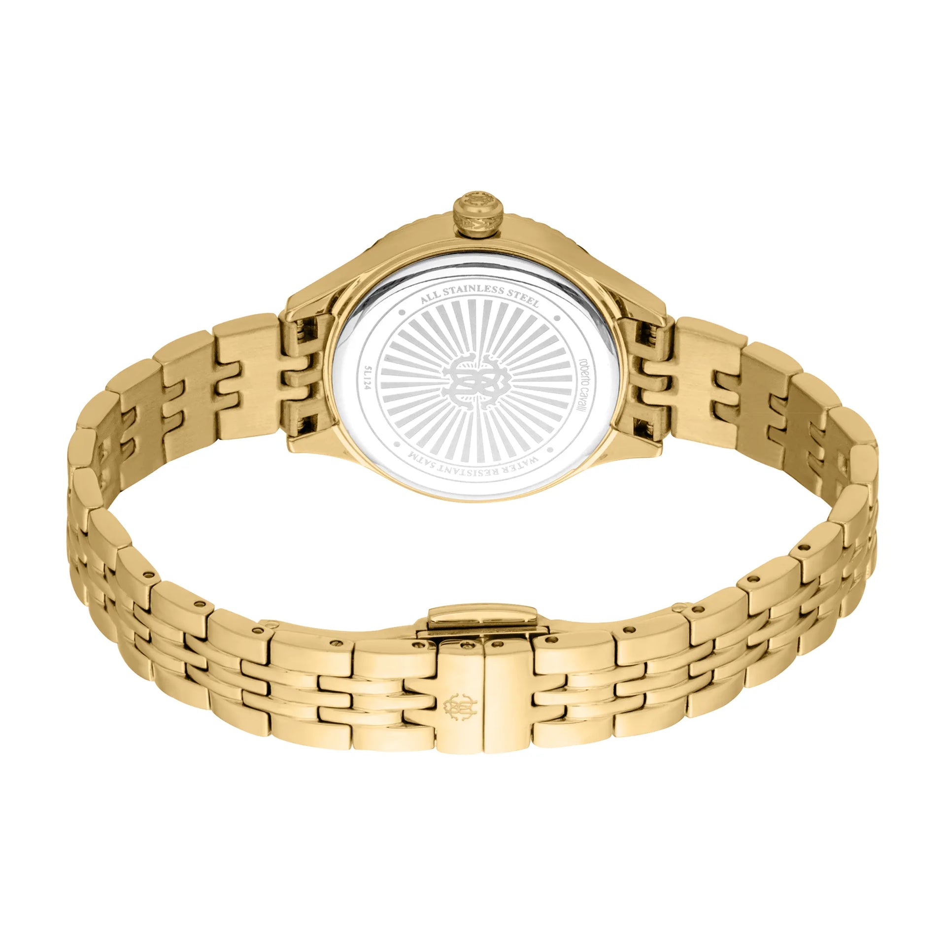 In der Welt der High Fashion, wo Eleganz auf Innovation trifft, entsteht eine Uhr, die das Wesen von Raffinesse und Stil verkörpert. Gefertigt im Herzen der Schweizer Uhrmacherkunst, ist diese Roberto Cavalli Lady Uhr ein Zeugnis für das Engagement der Marke für Luxus und Präzision. Ihr rundes Gehäuse, getaucht in den opulenten Glanz von Gelbgold, fängt das Licht bei jeder Bewegung ein und schafft einen faszinierenden Tanz der Reflexionen. Der Durchmesser von 28 mm findet die perfekte Balance zwischen Zurückhaltung und Präsenz und macht sie zu einer idealen Begleiterin für die moderne Frau, die sowohl Anmut als auch Funktionalität schätzt. Das silbergraue Zifferblatt, eine Leinwand zurückhaltender Schönheit, ist mit drei zarten Zeigern versehen, die von einem zuverlässigen Quarzwerk angetrieben werden und sicherstellen, dass die Zeit immer auf Ihrer Seite ist. Das Mineralglas bietet eine klare Sicht auf das Zifferblatt und sorgt gleichzeitig für Haltbarkeit und Schutz. Eine Pull-&-Push-Krone verleiht einen Hauch klassischen Charmes und ermöglicht einfache Einstellungen. Das Edelstahlarmband, ebenfalls in Gelbgold, schmiegt sich mit einem Gefühl von verfeinertem Luxus um das Handgelenk und wird durch eine Butterfly-Faltschließe mit Druckknopf für mühelose Eleganz gesichert. Mit einer Wasserdichtigkeit von bis zu 50 Metern ist diese Uhr so vielseitig wie schön und bereit, Sie vom Konferenzraum bis zum Abend auszuführen. Das Kaliber GL32 sorgt für Präzision und macht diese Uhr nicht nur zu einem Accessoire, sondern zu einem Statement von Stil und Raffinesse.